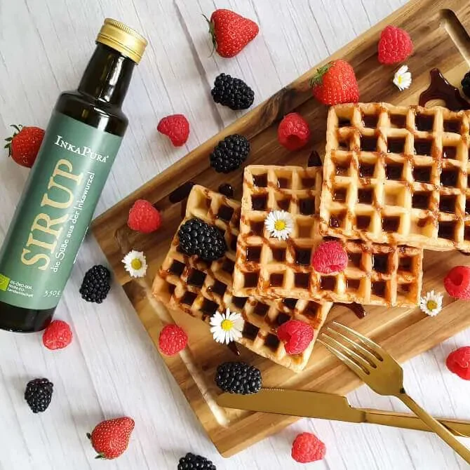Mit Sirup oder Pulver aus Yacon (Inkawurzel) bietet InkaPura ein natürliches Süßungsmittel ohne zugesetzten Zucker und wenig Kalorien. Yacon erhält seine natürliche Süße durch komplexe Kohlenhydrate statt durch Einfachzucker wie z. B. in Agavendicksaft oder Kokosblütensirup. Diese fördern im Darm als Ballaststoff das Wachstum guter Darmbakterien. Du kannst dich mit Yacon also buchstäblich gesünder naschen. Für Diabetiker ist er ebenfalls geeignet, da er den Blutzuckerspiegel kaum erhöht.